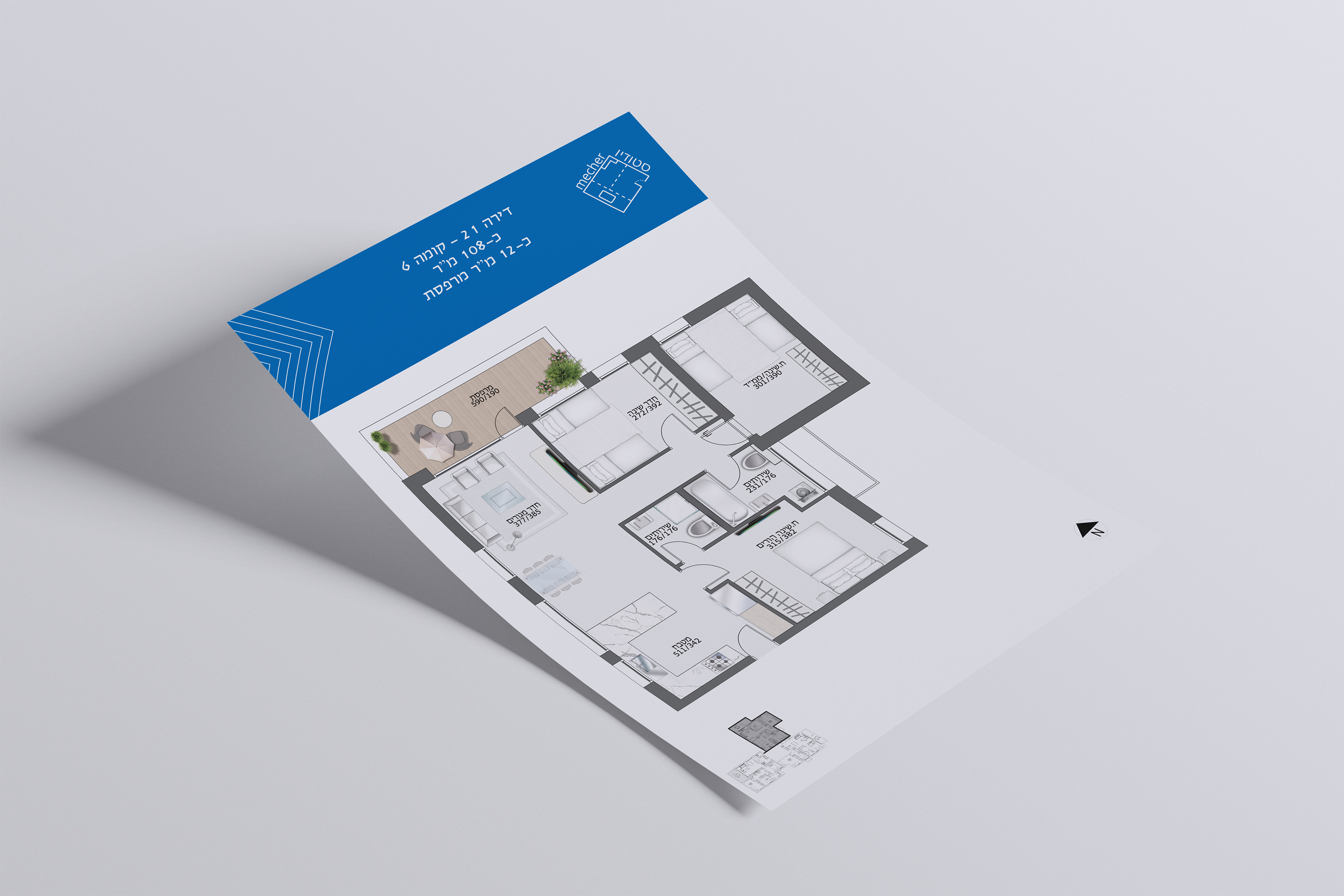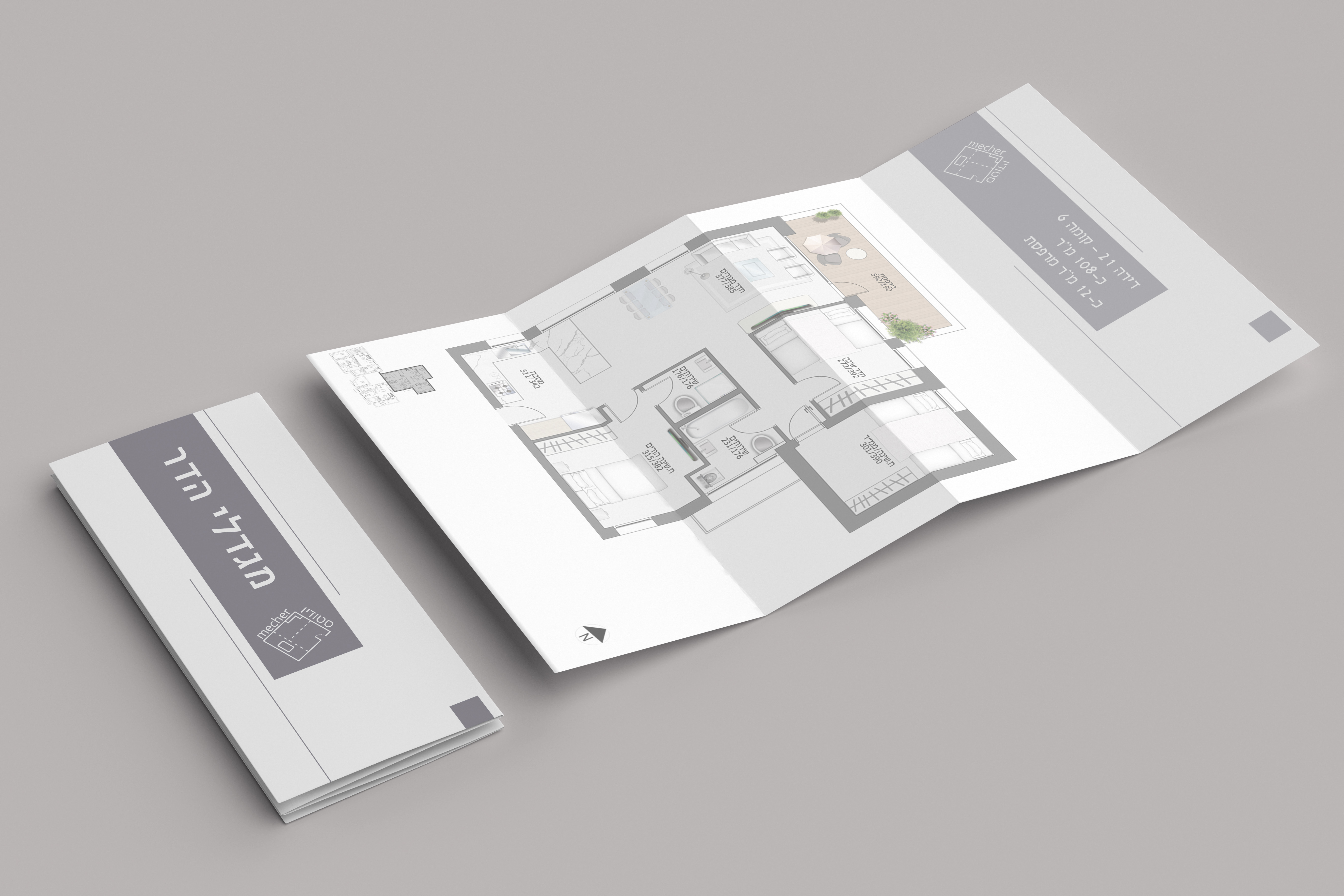 התוצרים מגיעים אליכם מוכנים לשימוש – בתוך חוברת, פולדר או ברושור – כולל כל מה שצריך: מפרט טכני, חץ צפון, מיקום הדירה, לוגו ועוד.